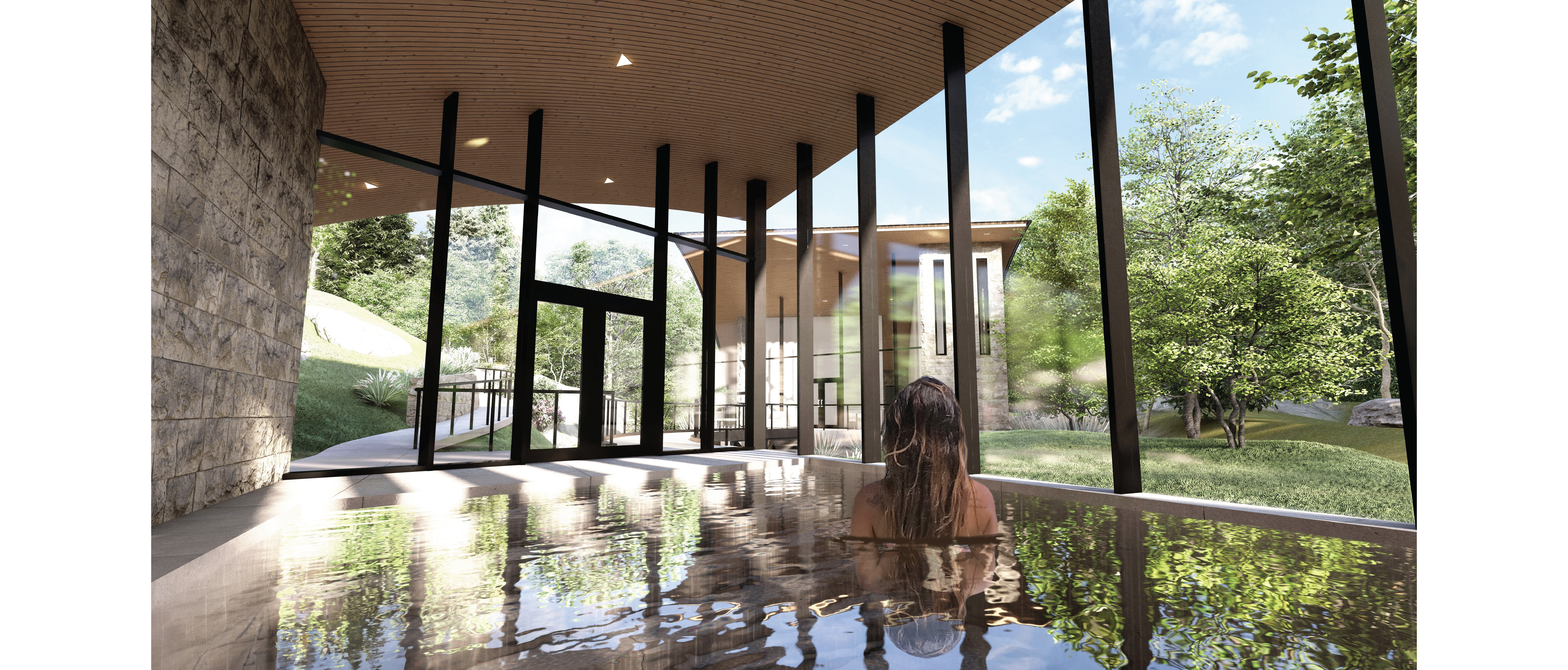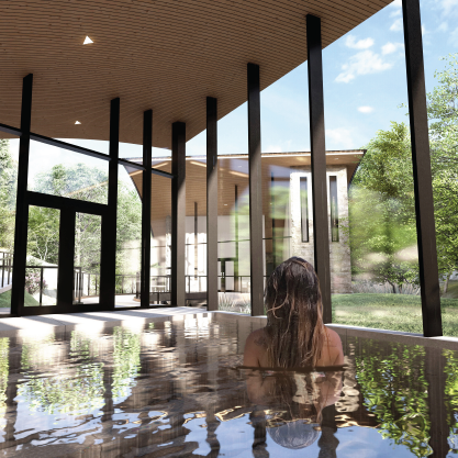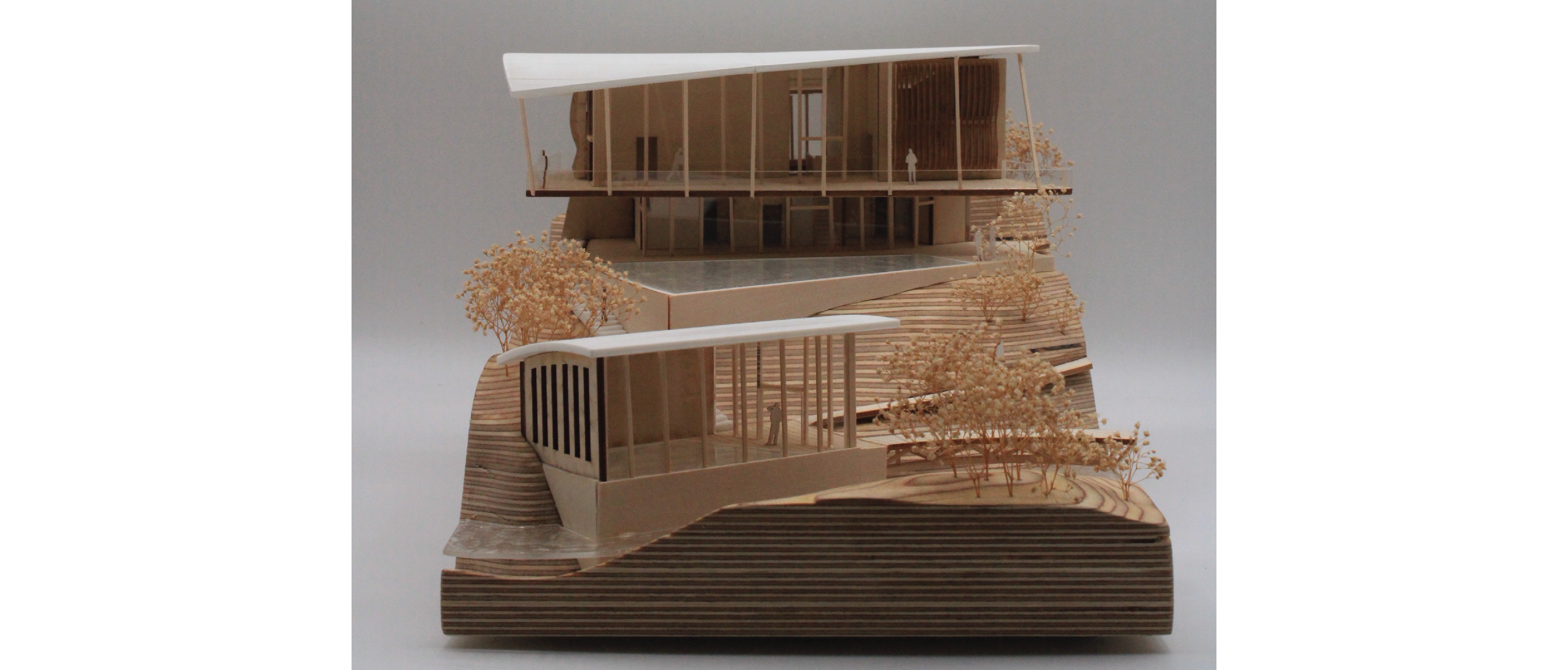 This bath house program takes inspiration from many different experimentation methods learned early in the semester. It contains three ADA accessible buildings connected by a bridge, ramps, and stairs. For this program, I wanted to create a space that was visually intriguing and allowed its patrons to feel connected to their natural surroundings. To achie ve these goals, these three buildings combine the use of acute shadows, large curtain windows, ruled surfaces, and sun shades. These aspects allowed me to create a space that is not only dynamic but inviting and visually appealing. The simplicity of this concept allows the patrons to find a sense of relaxation aside from their chaotic day to day life. Furthermore, their focus is directed towards the surrounding nature and unique shadows created by the roof supports and sun shades. When it comes to the roof design, I gained inspiration from two things: the contour of the hillside and the idea of a wave. In the first part of the semester, I experimented with different ways of correlating roof structures with the ground that supported it. The idea of the wave came as I began to think more about the behavior of water in these pools and the river below. With these factors in place, I was able to create a space where the buildings were integrated into the landscape.