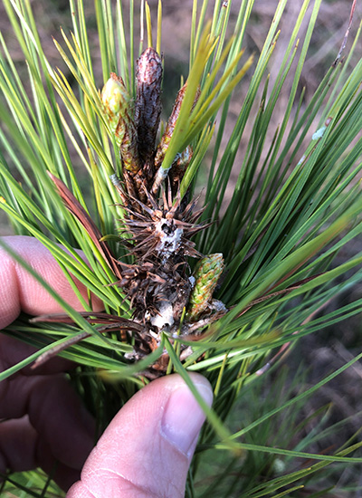 The Nantucket pine tip moth (Rhyacionia frustrana) is a pest of Virginia pine. Adult moths lay their eggs on pine needles, and the larvae first feed in the needle and eventually bore into the shoot tip, resulting in tip mortality. Up to four generations can occur each year in South Carolina. Pheromone traps can help determine the best time to apply insecticides to the tree to reduce damage. Infested shoots can be removed by hand, but this may impact tree form.